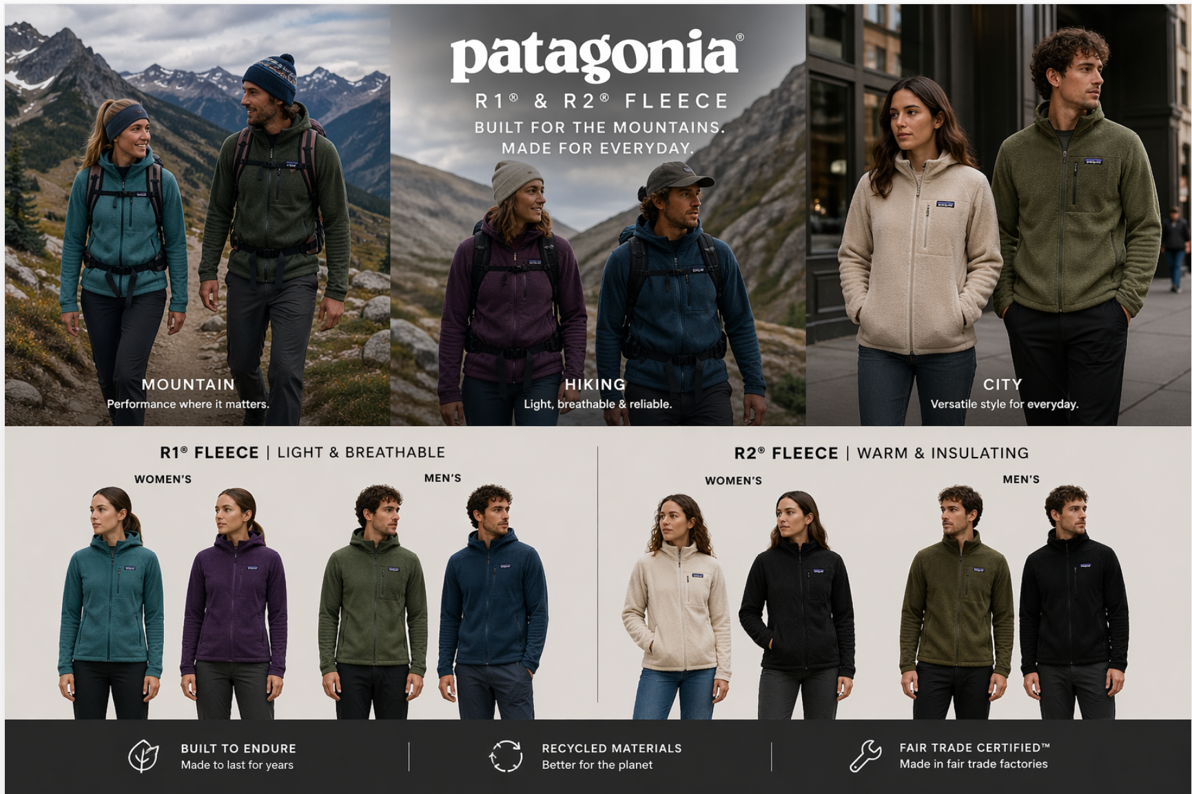 Light, convenient hooded sweater that combines two different fleece fabrics to warm where it is needed most and keep weight and packing volume down.